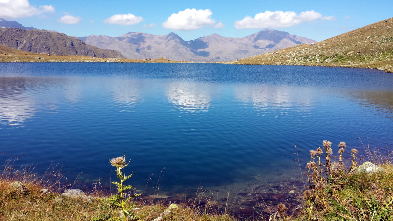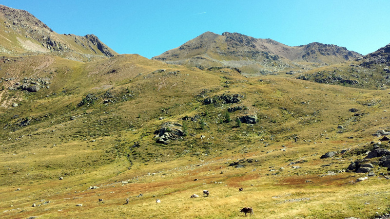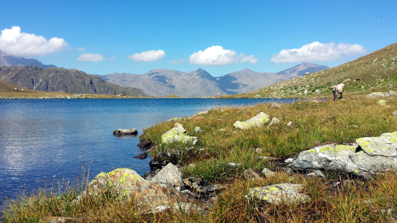 Walscher Berg vermerkt. Der Weg wird nun steiler und es ist nur noch ein Pfad vorhanden. Nach weiter 45 Minuten langt man zu einer Stelle wo der Bach den wir die meisste Zeit links neben uns haben kurz aufgestaut wird. Hier ist eine (kaputte) Holzbrücke vorhanden, hier nicht die Brücke queren sondern weiter gerade aus immer hochgehen. Nach ca. 30 Minuten kommt man zu einer Hochebene, wo wir weidende Kühe neben einer wunderbar urigen Alm (nicht bewirtschaftet) sehen. Hier folgt man nun der Markierung „Alplaner See“, die Markierungen sind alle neu, wir queren die Hochebene und nach ca weiteren 30 Minuten haben wir den kleinen See vor uns, bevor wir einige Minuten weiter auch den grossen Alplaner See sehen.